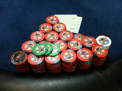 Anyway, I ended up playing only an hour and a half.  My table had a couple of guys I figured would spew chips, and I was right.  One guy was trying to be a table bully, but I quickly figured him out, letting him three barrel me with air.  One hand, I held 65o, called him all the way down with fourth pair, and won.  An orbit later, I held 54s, flopped the flush draw, and called his river bet after I missed with just bottom pair, and again raked the chips.  Thank you!  Come again!